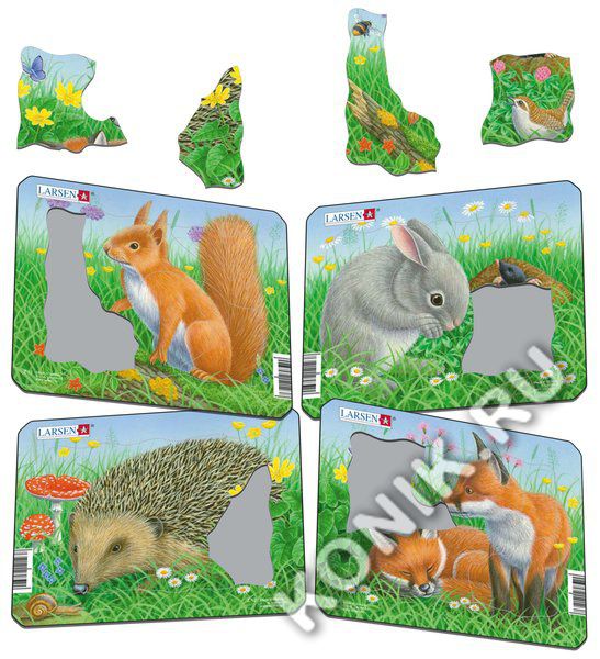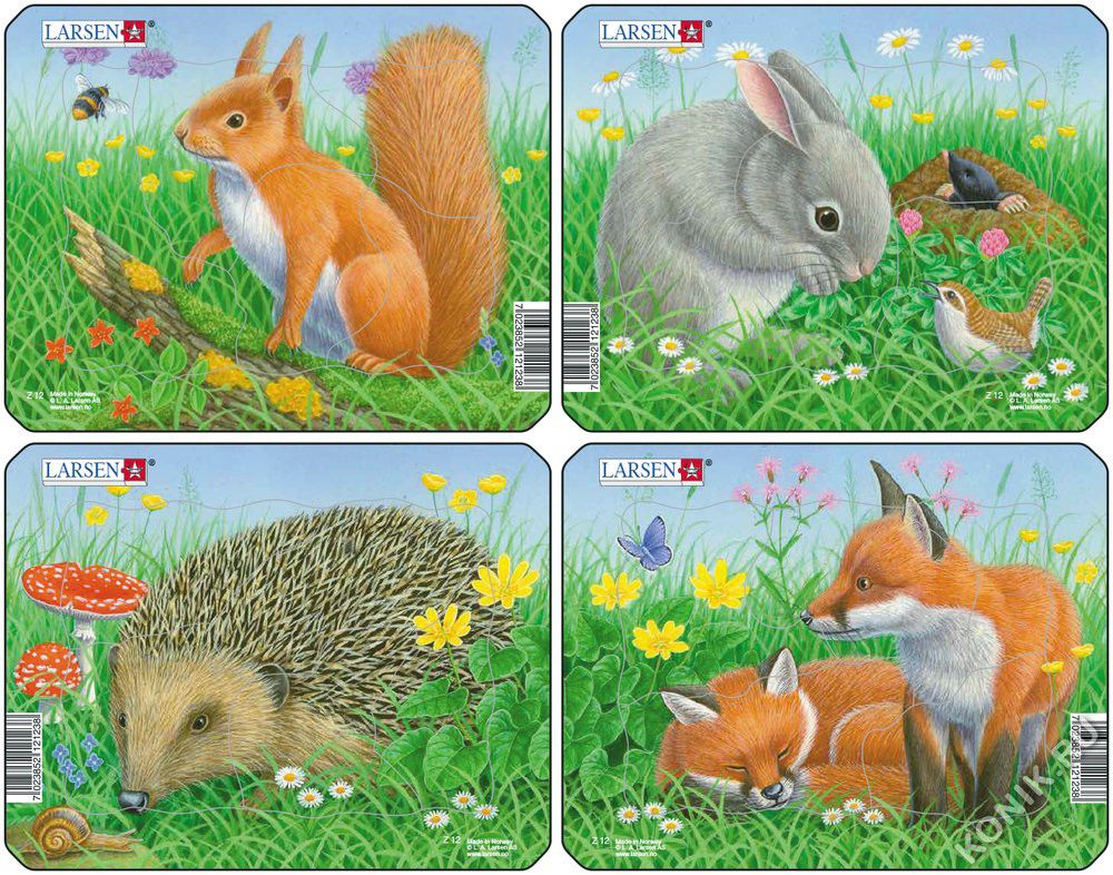 Перед вами 4 пазла с милыми дикими животными на лугу с зеленой травой и красивыми цветами. Кролик наблюдает за маленькой птичкой, а крот высовывает голову из норы в земле. Ежик обнюхивает улитку. Щенок лисы сладко спит, в то время как его брат изучает пролетающую мимо бабочку. Шмель со свистом пролетает перед маленькой белочкой, стоящей на стволе старого дерева. Боится ли белочка, что шмель ужалит? Каждый из пазлов состоит из 5 больших частей, которые отлично подходят для маленьких детей, которые учатся собирать свои первые пазлы. Неподвижная рамка помогает маленьким ручкам расставлять детали по своим местам. Набор из 4 головоломок.