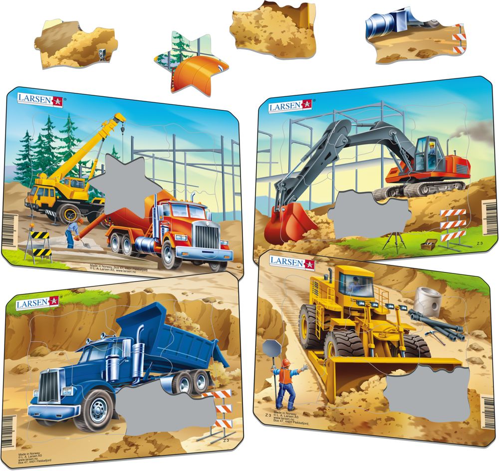 Эти 4 пазла созданы для детей, которые любят большие машины. На одном из пазлов изображен бетоновоз, доставляющий бетон на строительную площадку, на заднем плане - большой автокран. На другом пазле изображен большой экскаватор за работой. На третьем пазле изображен большой грузовик, доставляющий груз гравия, а на четвертом - большой бульдозер за работой. Каждый пазл состоит из 7 частей и предназначен для маленьких детей. Здесь есть о чем поговорить, и многое может стимулировать воображение маленьких детей, которые очарованы большими строительными машинами. Набор из 4х видов пазлов.