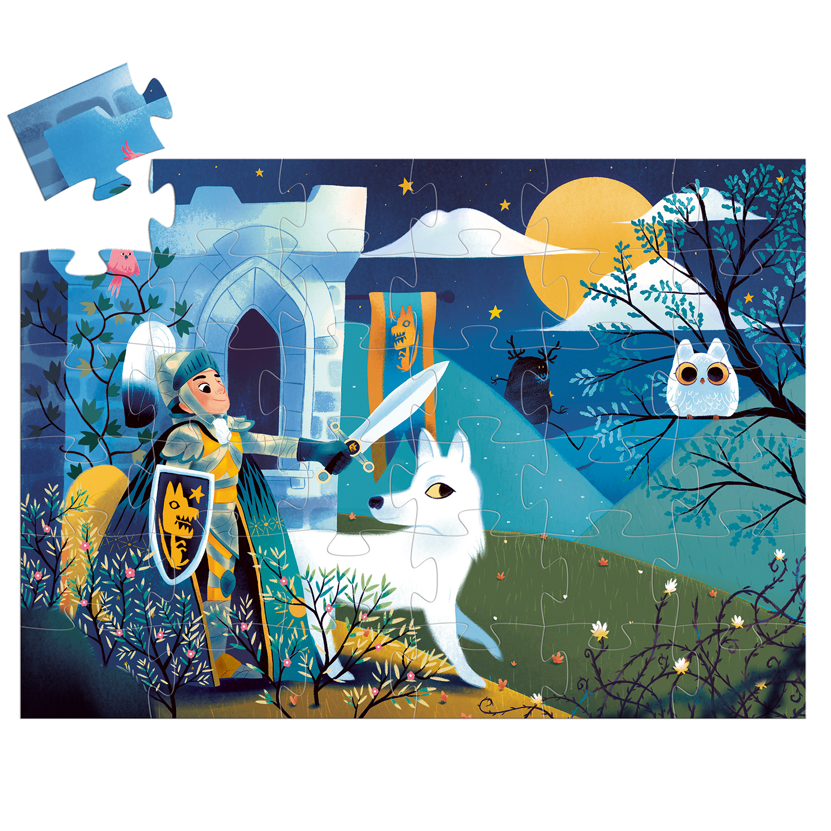 Рыцарь и его волк защищают свой замок при свете полной луны. Превосходный пазл из 36 частей в стильной коробке в форме рыцаря.