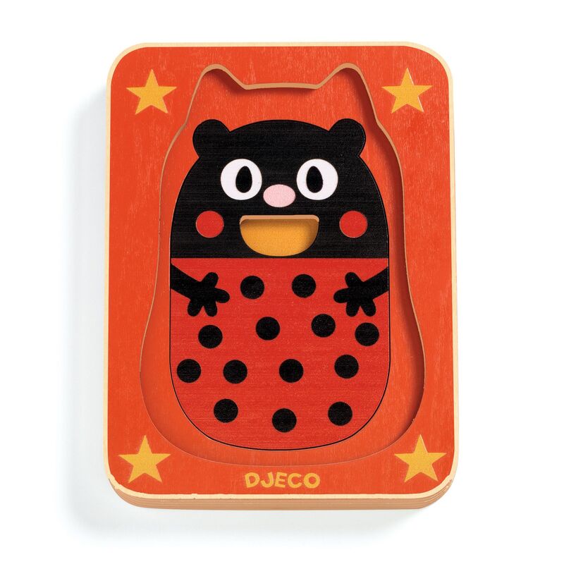 Деревянный пазл-трио «Макс и компания» от Djeco познакомит малыша с миром животных. Пазл состоит из трех частей и трех уровней: фигурки складываются друг на друга, делая игру еще более интересной. Постепенно вынимая детали, дети обнаруживают, что кошачий мячик на самом деле является туловищем божьей коровки, а рот божьей коровки — клювом вороны и т.д.