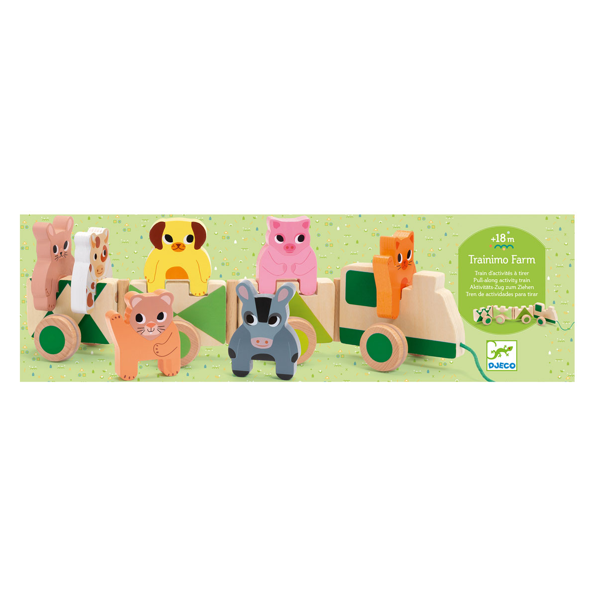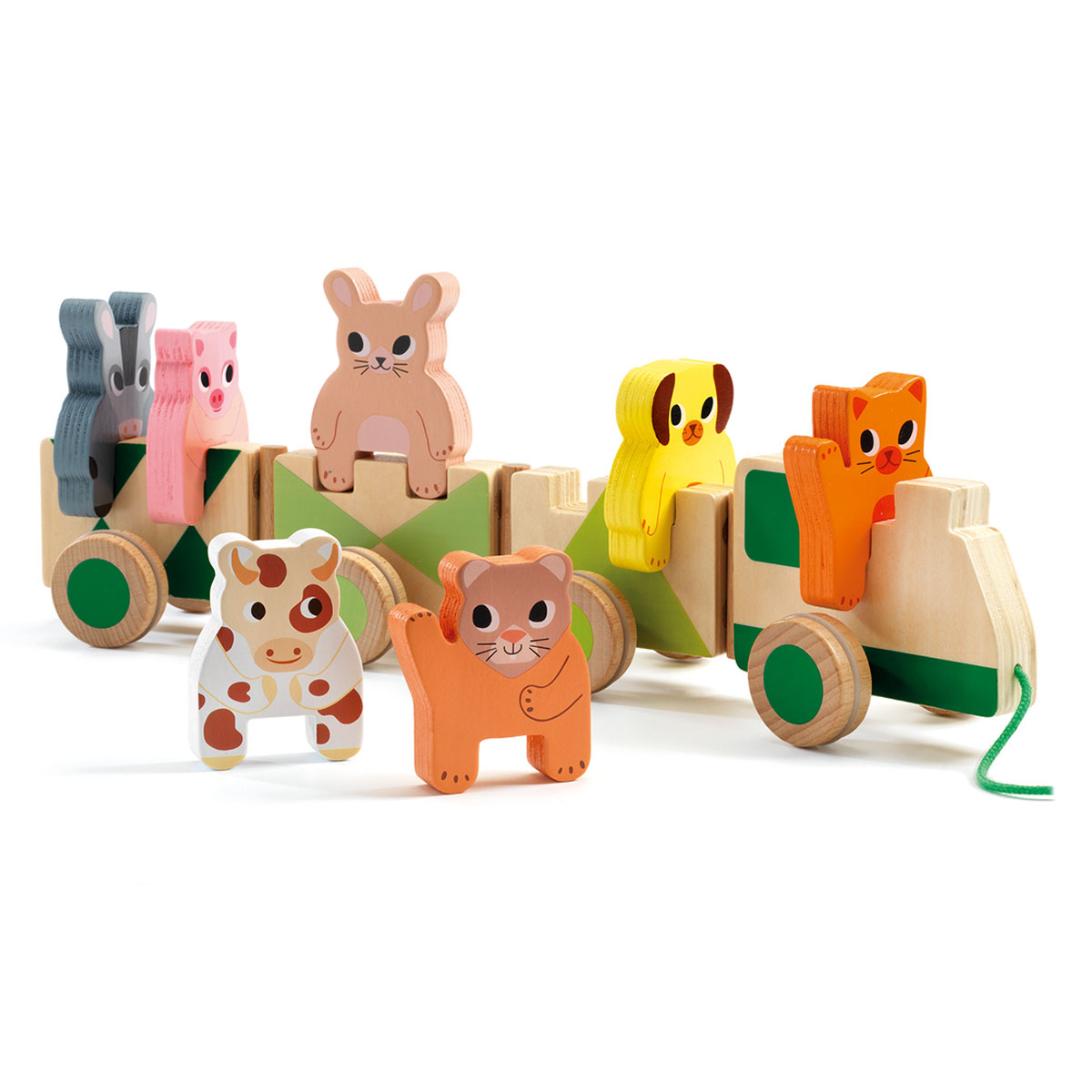 Симпатичный и красочный деревянный поезд с пассажирами-животными с фермы. Детям понравится сажать семерых животных в четыре вагона и тянуть их за веревку. Когда животные не в поезде, они стоят вертикально, и дети могут придумывать с ними игры!
