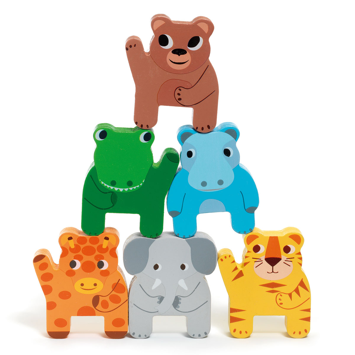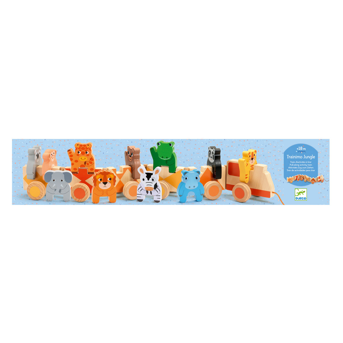 Большой красочный деревянный поезд с пассажирами-животными из джунглей. Детям понравится сажать 11 животных в 6 вагонов и тянуть их за веревку. Когда животные не в поезде, они стоят вертикально, и дети могут придумывать с ними игры!