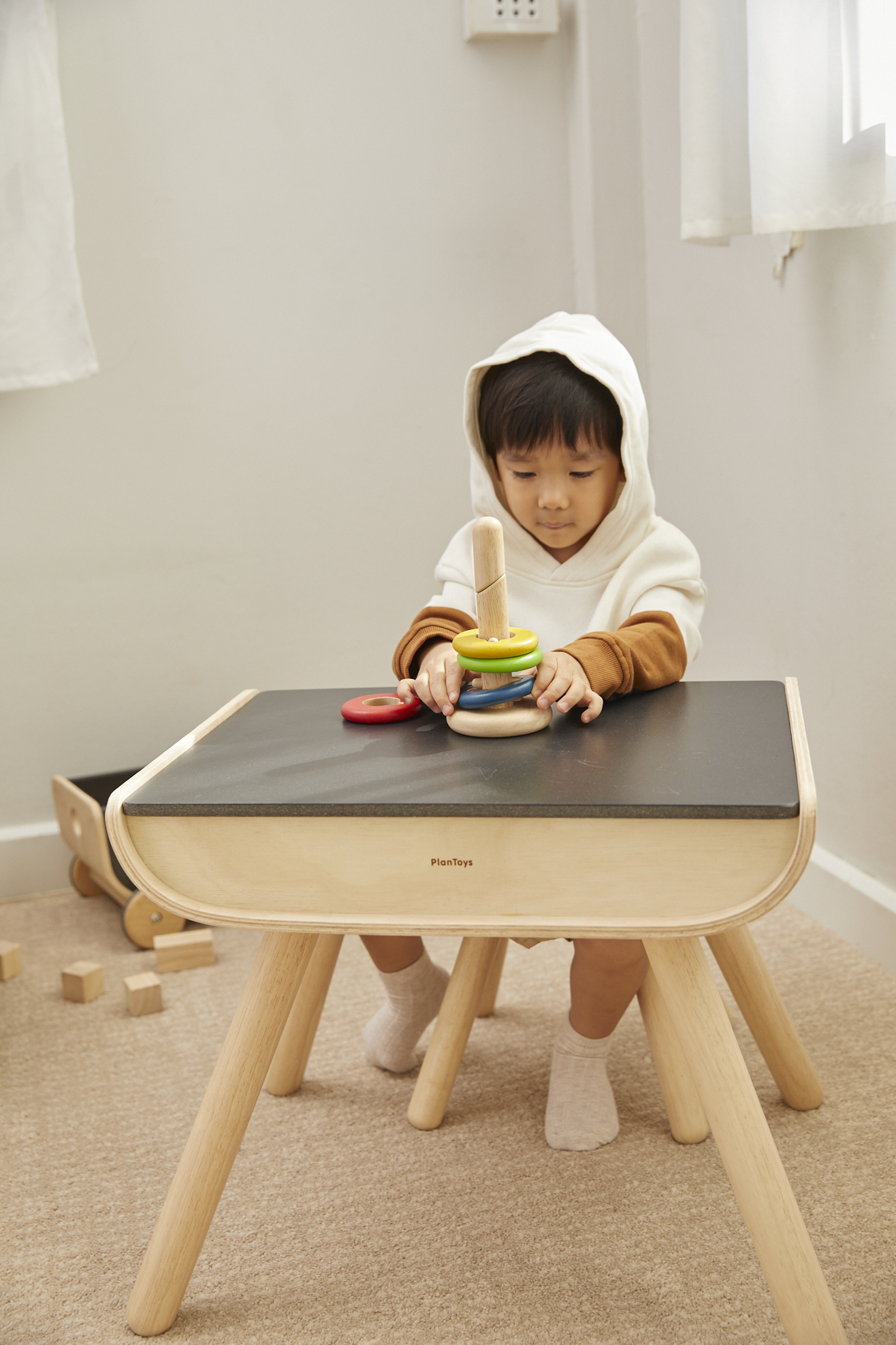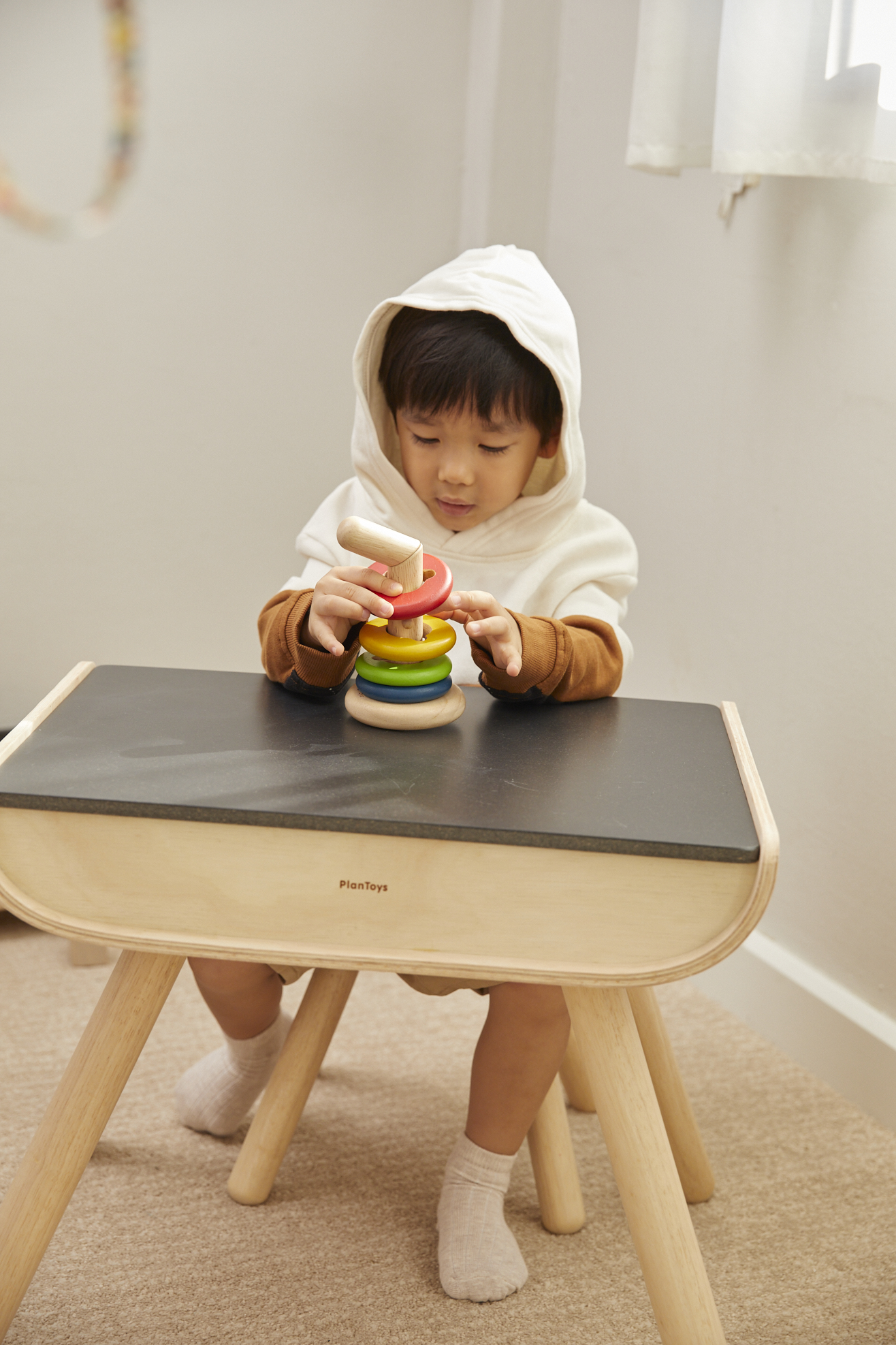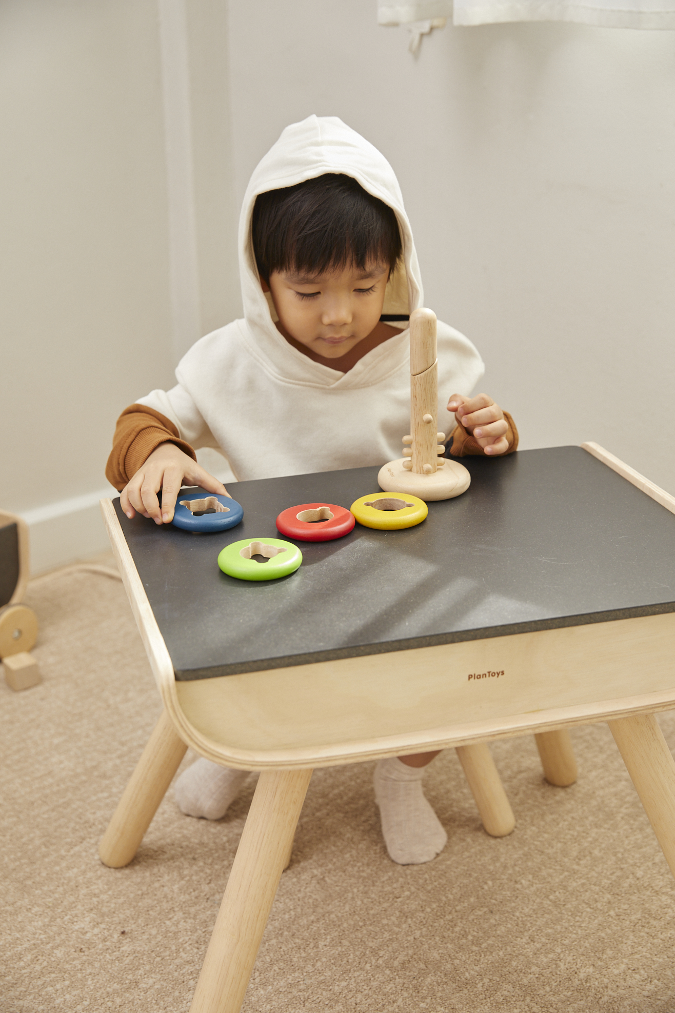 Пирамидка «Поверни и собери» от PlanToys – замечательный вариант развивающей игрушки для самых маленьких! Пирамидка состоит из четырех колец и платформы, на которые их нужно устанавливать. Для каждого элемента есть свое место на стержне. Игрушка знакомит малыша с понятиями высоты, размера и последовательности.