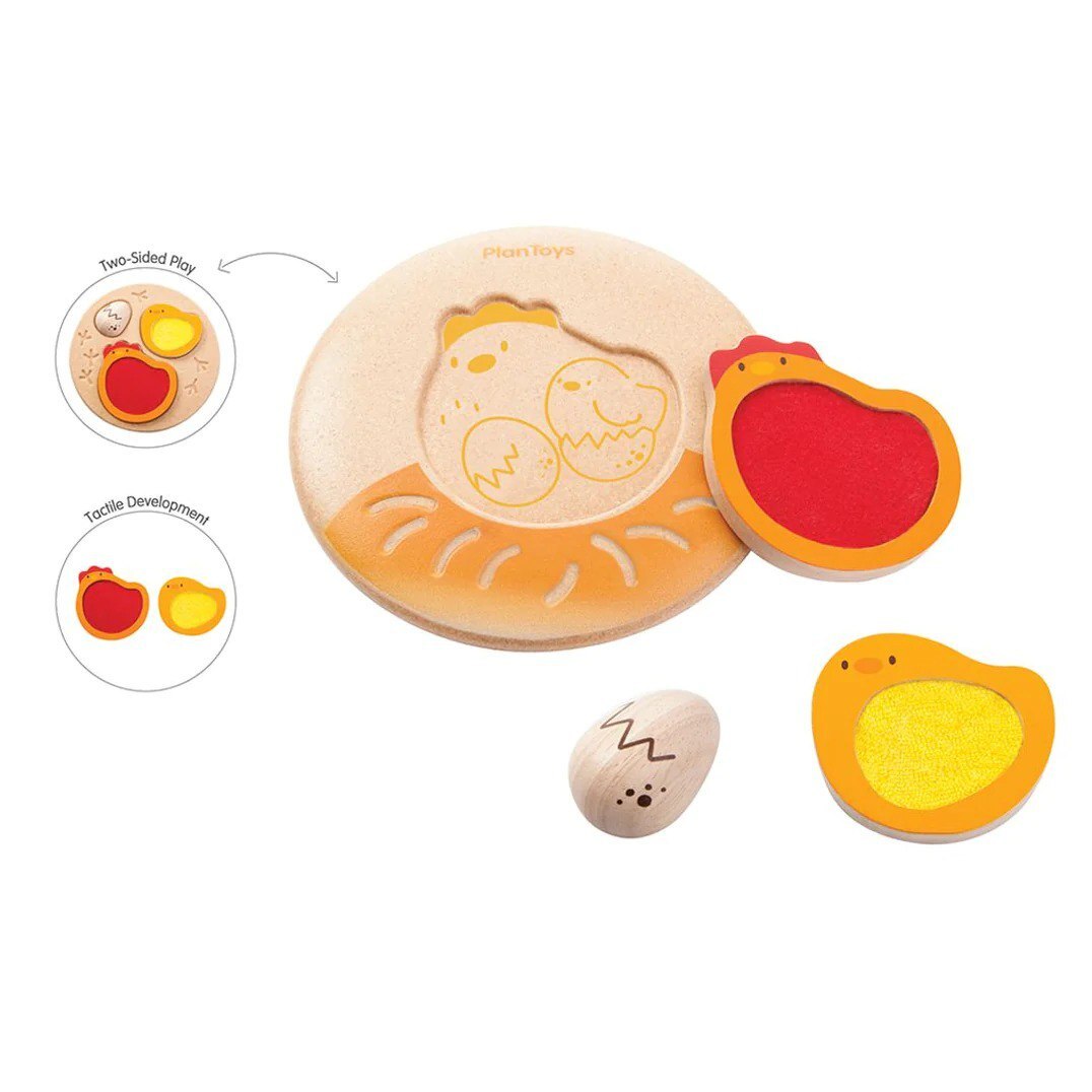 В наборе ребенок найдет круглое основание для сборки пазла, фигурки курочки, цыпленка и яичка. На деревянном основании малыш должен выставить фигурки таким образом, чтобы получилась история жизненного цикла курочки. На обратной стороне основания можно расположить фигурки друг на друге, начиная с самой широкой.