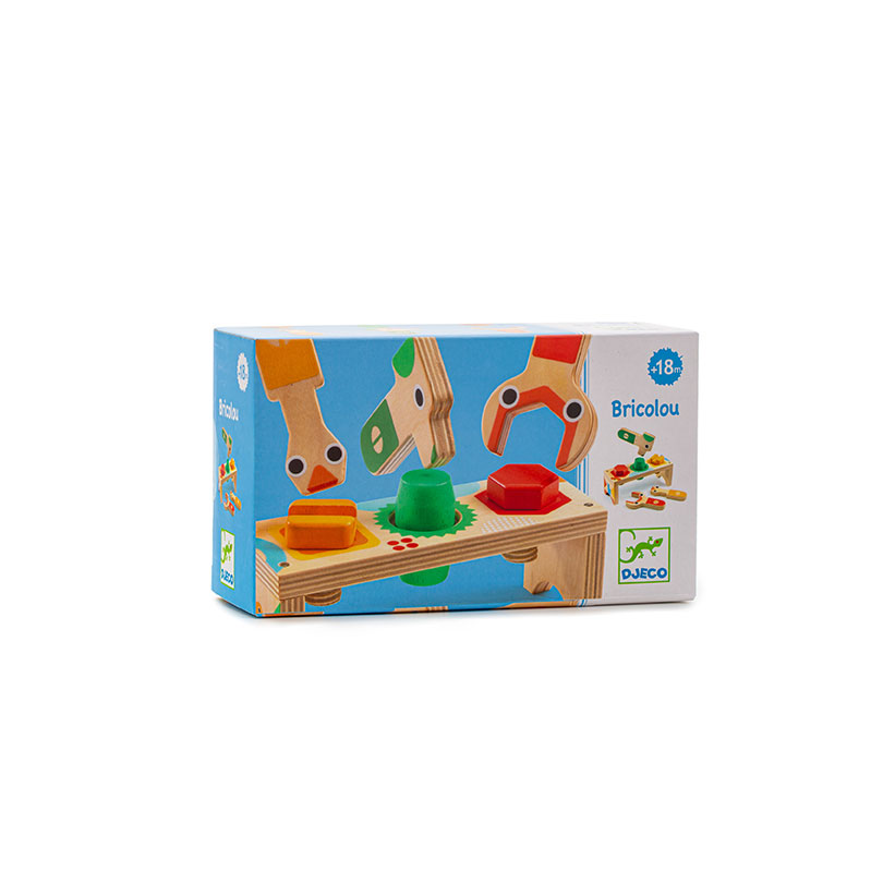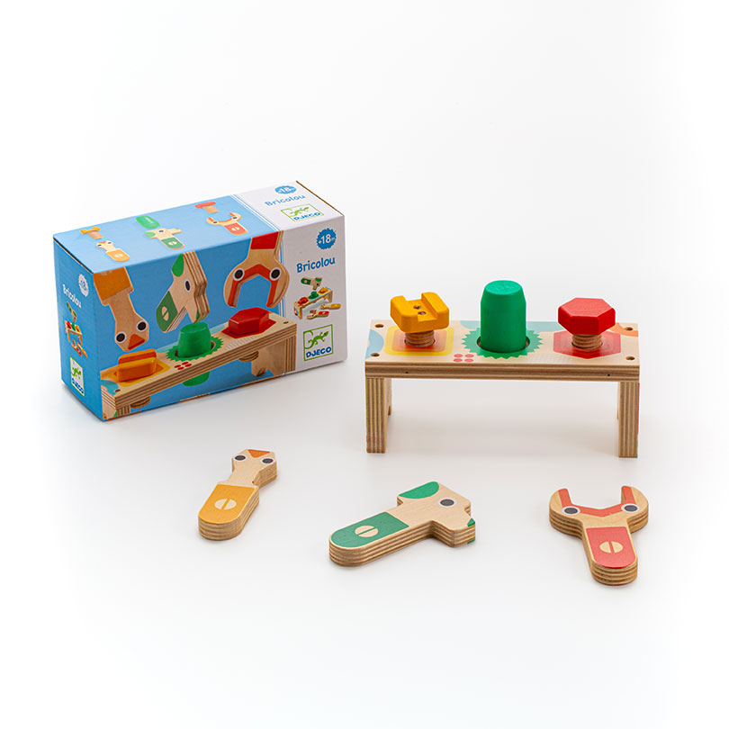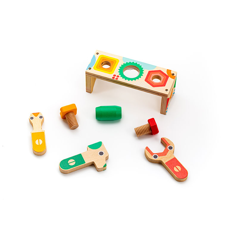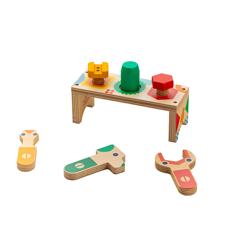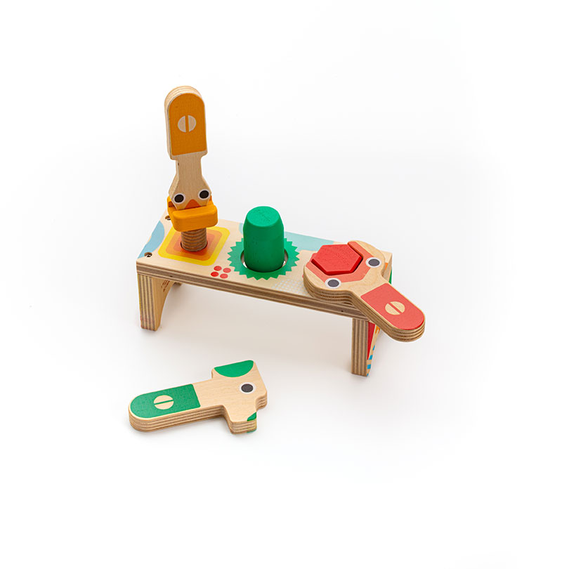 Мини-верстак для любителей делать своими руками в возрасте от 18 месяцев. Ориентируясь на цвета и формы, дети ищут на верстаке место, соответствующее каждой детали: зеленому гвоздю, желтому шурупу и красной гайке. Затем они должны выбрать правильный инструмент для крепления компонентов: гаечный ключ, молоток или отвертку.