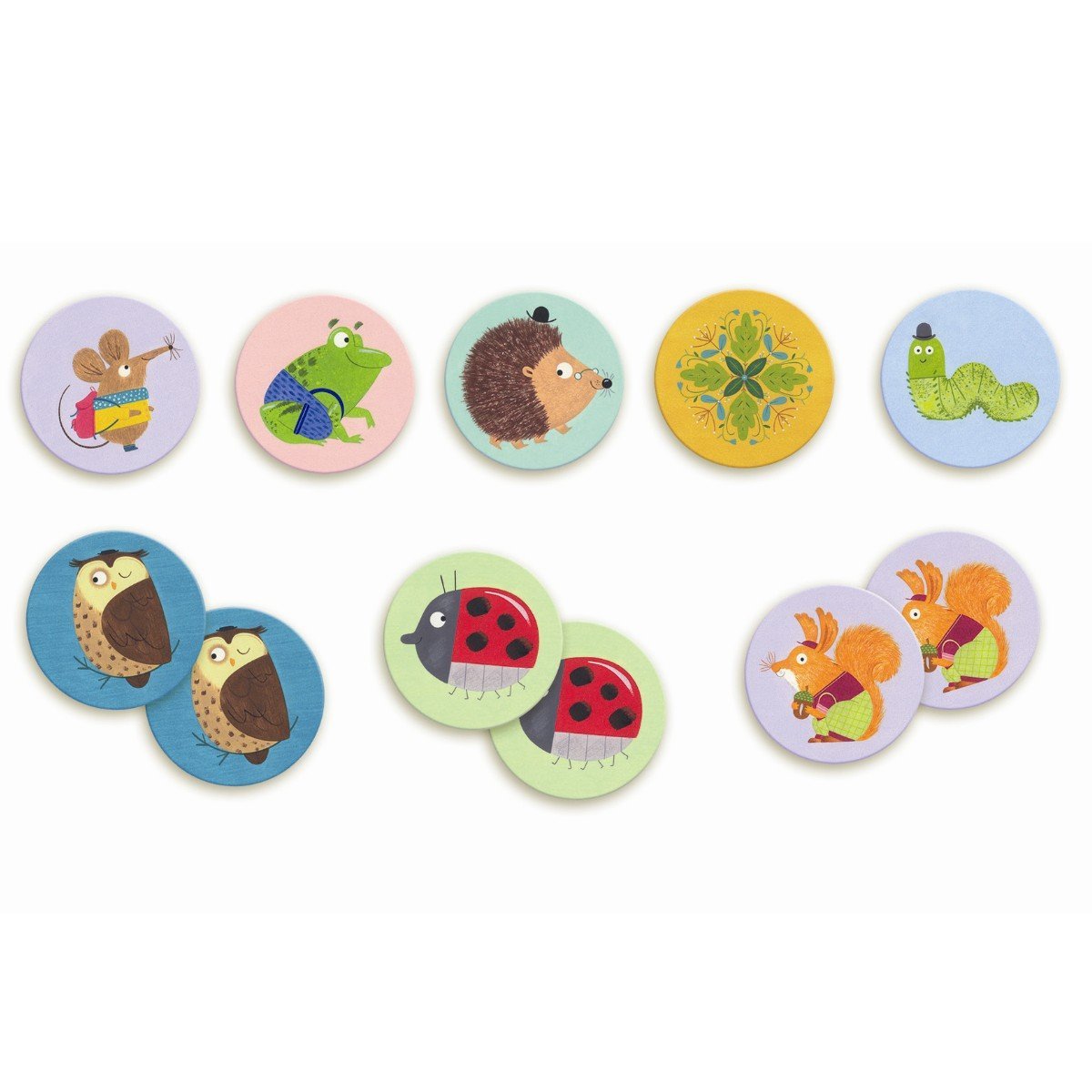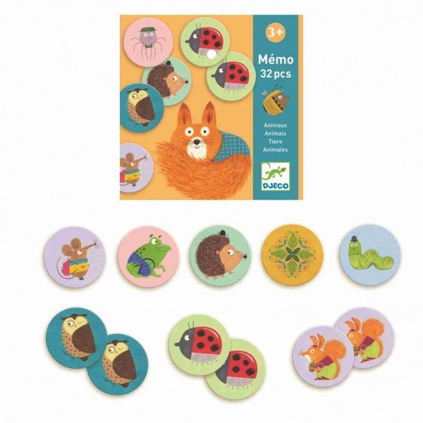 Развивающая игра мемо Животные от французского производителя Djeco (Джеко) - это прекрасная настольная игра на развитие памяти, внимательности и быстроты реакции. В комплект входит 32 карточки диаметром 7,8 см с парными изображениями забавных животных, птиц. Правила игры просты: все карточки перемешиваются и переворачиваются картинкой вниз, затем первый игрок должен перевернуть 2 из них, если ему удалось найти одинаковые изображения, игрок забирает себе эти карточки, если нет, то карточки остаются на столе. Победитель тот, кто собрал больше всех карточек. С помощью игры мемо Животные ваш малыш узнает и запомнит разных животных и птиц, также с карточками можно поиграть на внимательность, задавая вопросы, например, "А кто из животных держит желудь?" или " А кто из животных носит очки и шляпку?". Игра способствует развитию мелкой моторики, внимательности, памяти и усидчивости, расширяет словарный запас. Французская компания Джеко уже более 60 лет производит развивающие игрушки и игры для детей, наборы для творч