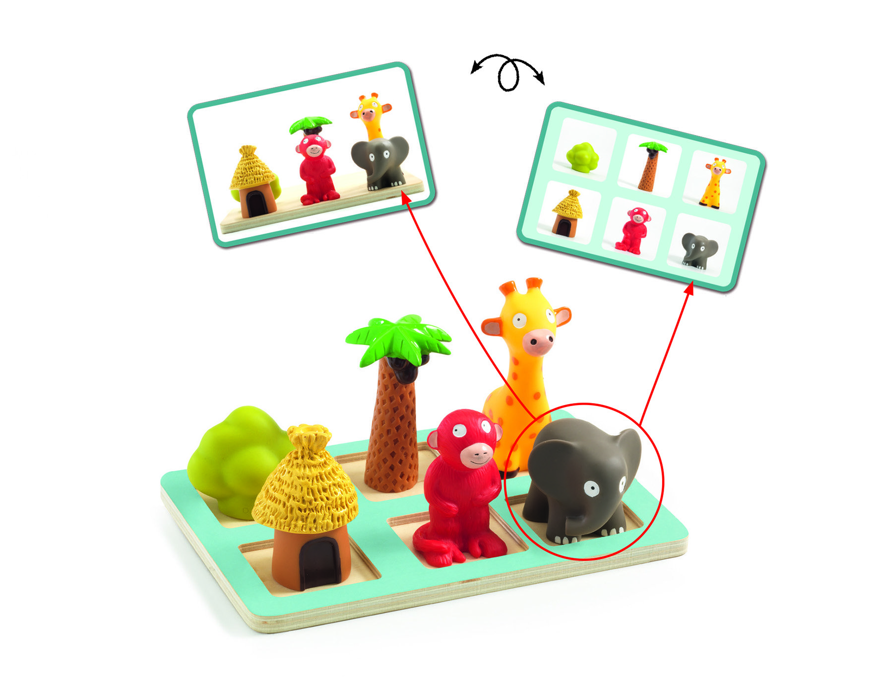Веселая и простая игра из коллекции Eduludo для обучения детей пространственным связям, в которой они должны правильно расставлять фигурки на доске, чтобы воспроизвести картинку. Где жираф? Это перед слоном или позади него? Слева или справа? Решения даны на обороте карточек.