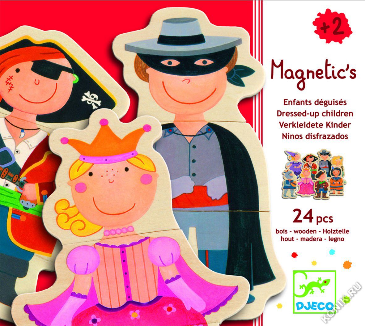 Магнитная развивающая игра Платья от французского производителя Djeco (Джеко) - это интересная и увлекательная игра для малышей от 2 лет. Игра представляет собой деревянные фигурки на магнитах, разделенные на три части. С помощью 24 деталей можно собрать 8 персонажей в различных костюмах или создать на свой вкус забавный, веселый наряд для своего бала-маскарада. Фигурки можно крепить на любую магнитную поверхность и украсить ими холодильник. Игра с деревянными магнитами развивает внимательность, мелкую моторику рук, воображение, логическое мышление, зрительное восприятие, усидчивость. Деревянные магниты экологически безопасны, приятны для детских ручек и способствуют развитию тактильных ощущений. Набор продается в красивой подарочной коробке с магнитным замочком, в которой можно хранить детали. Французская компания Джеко уже более 60 лет производит развивающие игрушки и игры для детей, наборы для творчества, а также детали интерьера детской комнаты и детские аксессуары. Все товары Джеко отличаются выс
