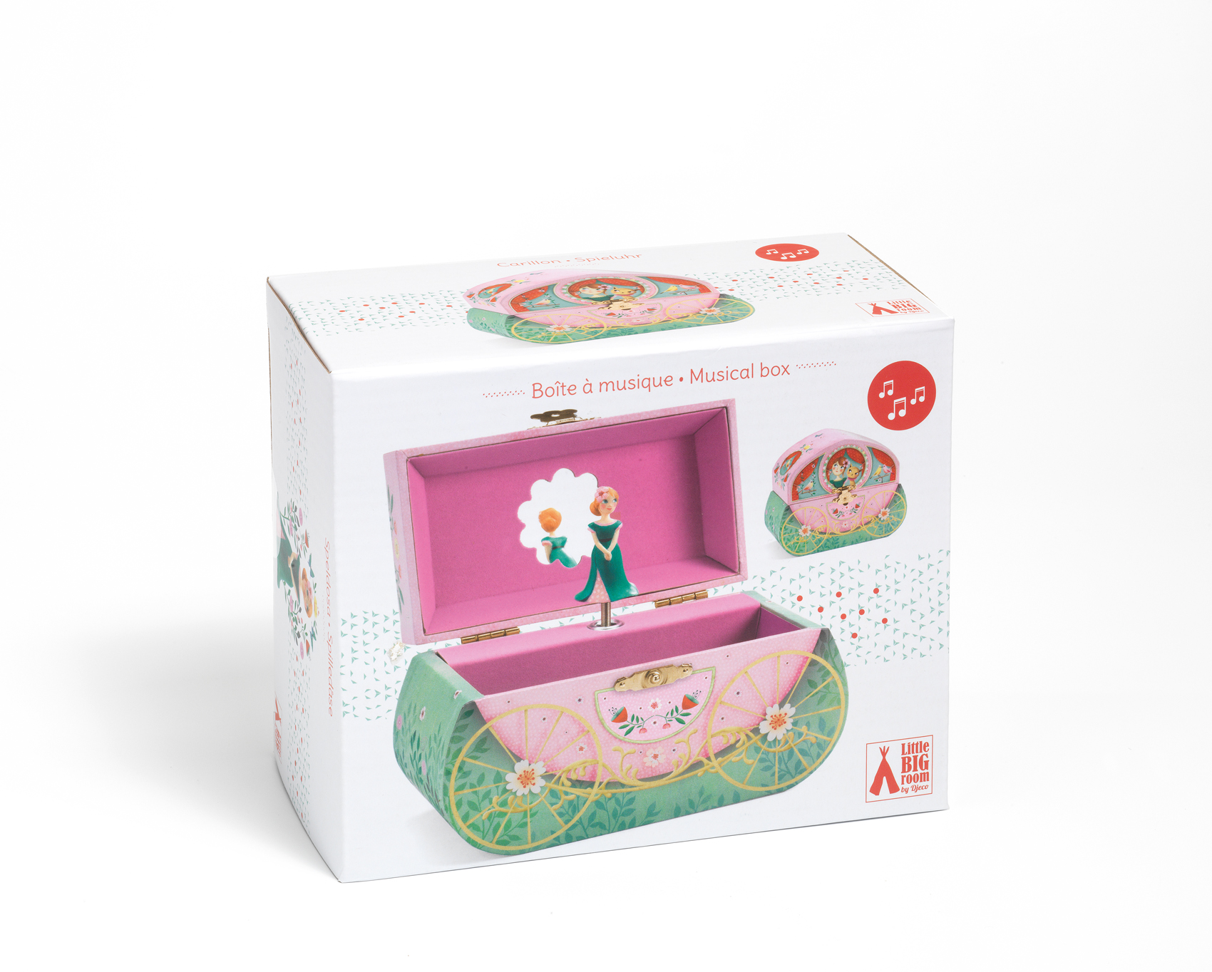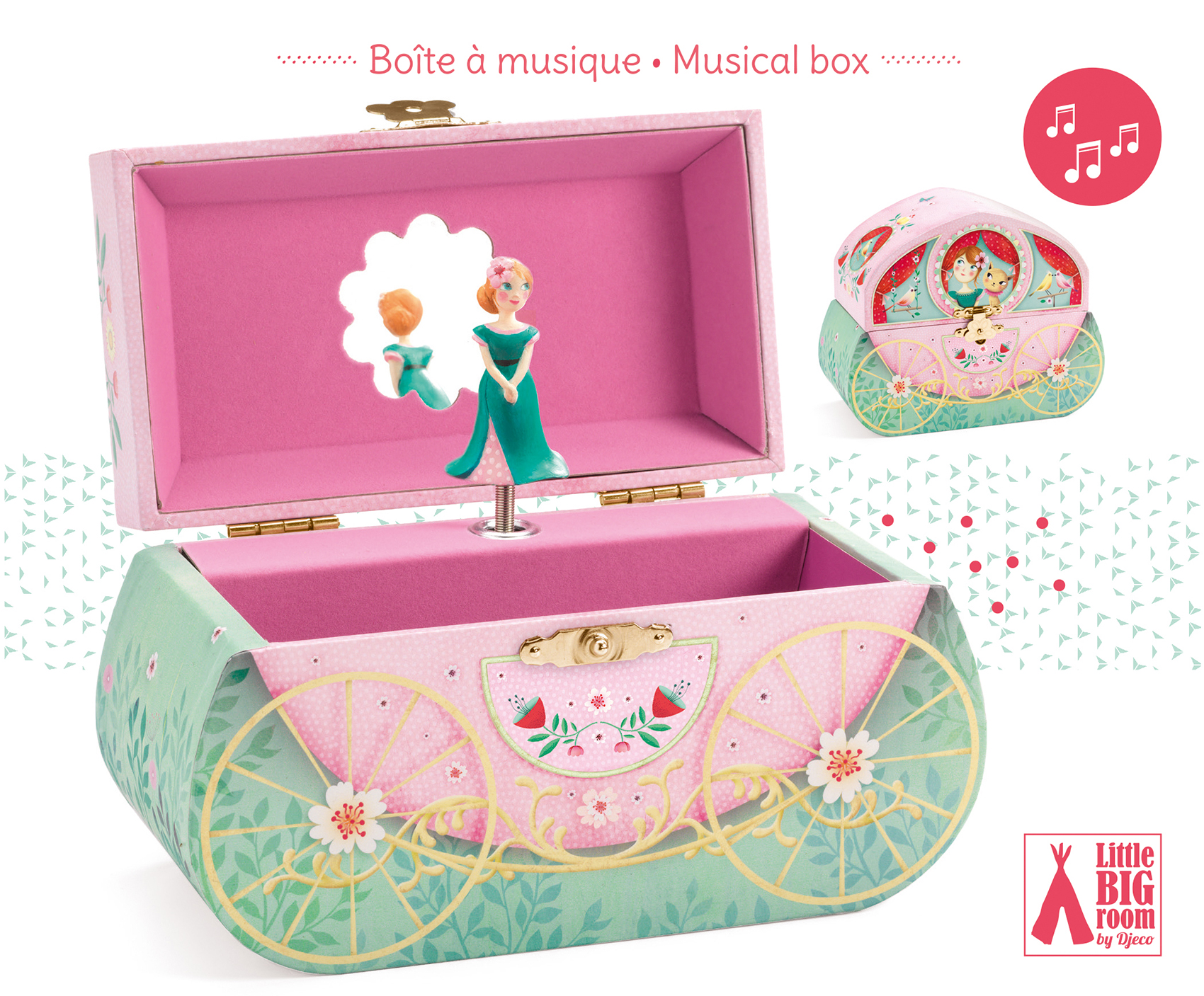 Carriage ride - это красивая музыкальная шкатулка в форме каретки для хранения украшений и секретных мелочей. Поверните ручку, откройте шкатулку, и она оживает: изящно вырезанная принцесса превращается, отражаясь в фигурном зеркале, под песню Лео Фридмана «Let Me Call You».