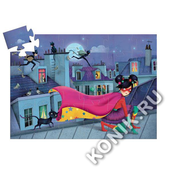 Детский пазл «Супер звезда» от французского бренда Djeco – это необычный игровой набор, который поможет развивать логическое мышление и моторику рук у малышей. Ребенку предстоит собрать великолепную картинку, на которой изображена девочка-супергерой, одетая в звездный плащ, бегущая по крышам зданий и сражающаяся со злодеями.
