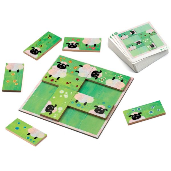 Вытягивайте карточки, на которых показано местоположение костяшек домино на поле, выполняйте задания и дополняйте другими костяшками, собирая картинку с овечками.