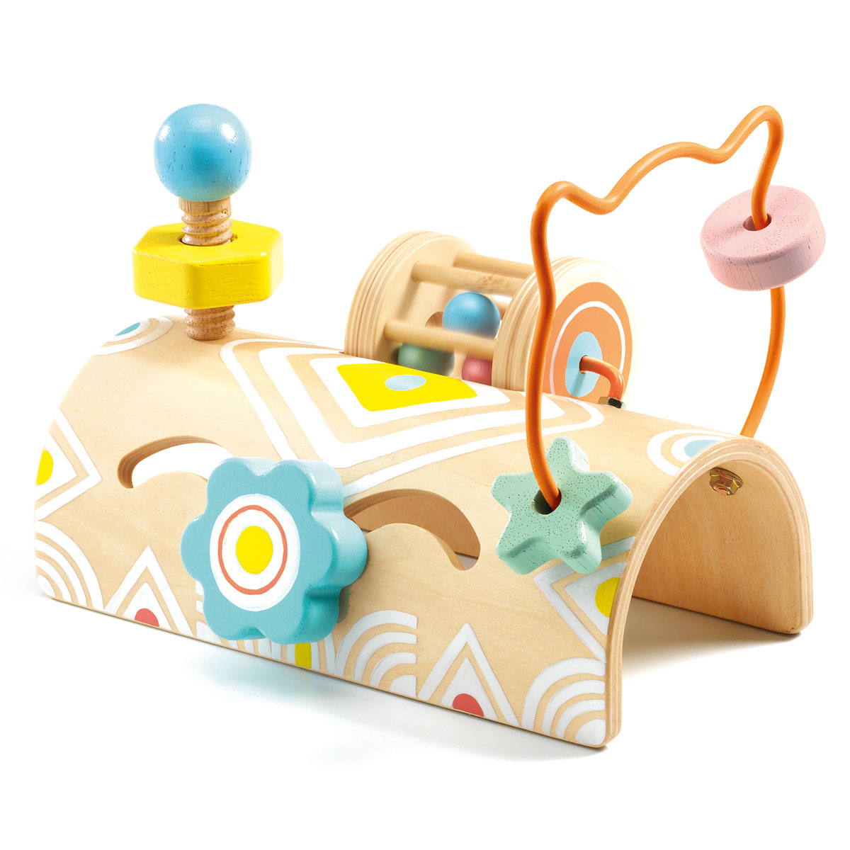 Превосходный сортер от французского производителя Djeco «Для малыша» создан специально для первых открытий малыша. Сортер сочетает в себе различные виды игр и упражнений: небольшие счёты, где нужно перекидывать деревянные элементы; ручка в виде цветка, которую нужно передвигать в разные стороны; деревянный винт, с которым можно научиться прикручивать; колесо с деревянными шарами внутри, которое нужно вращать.