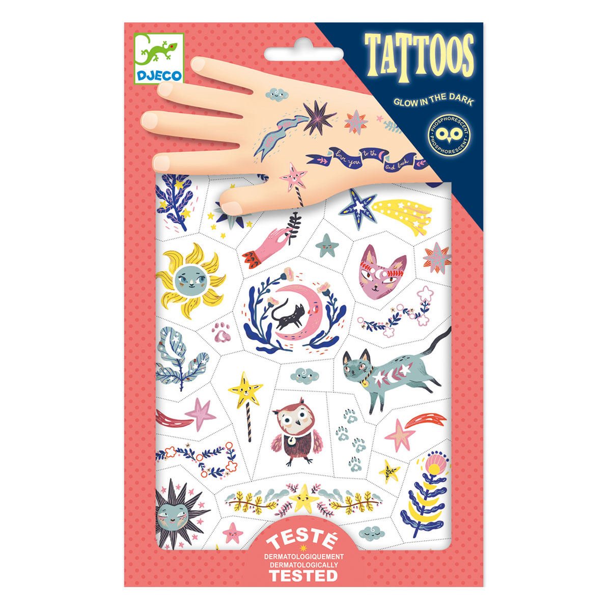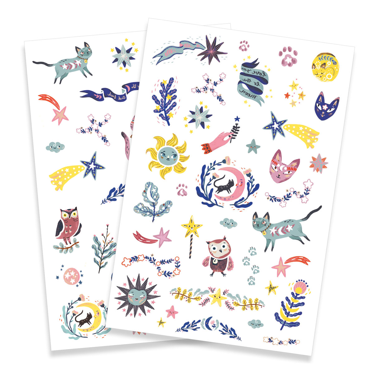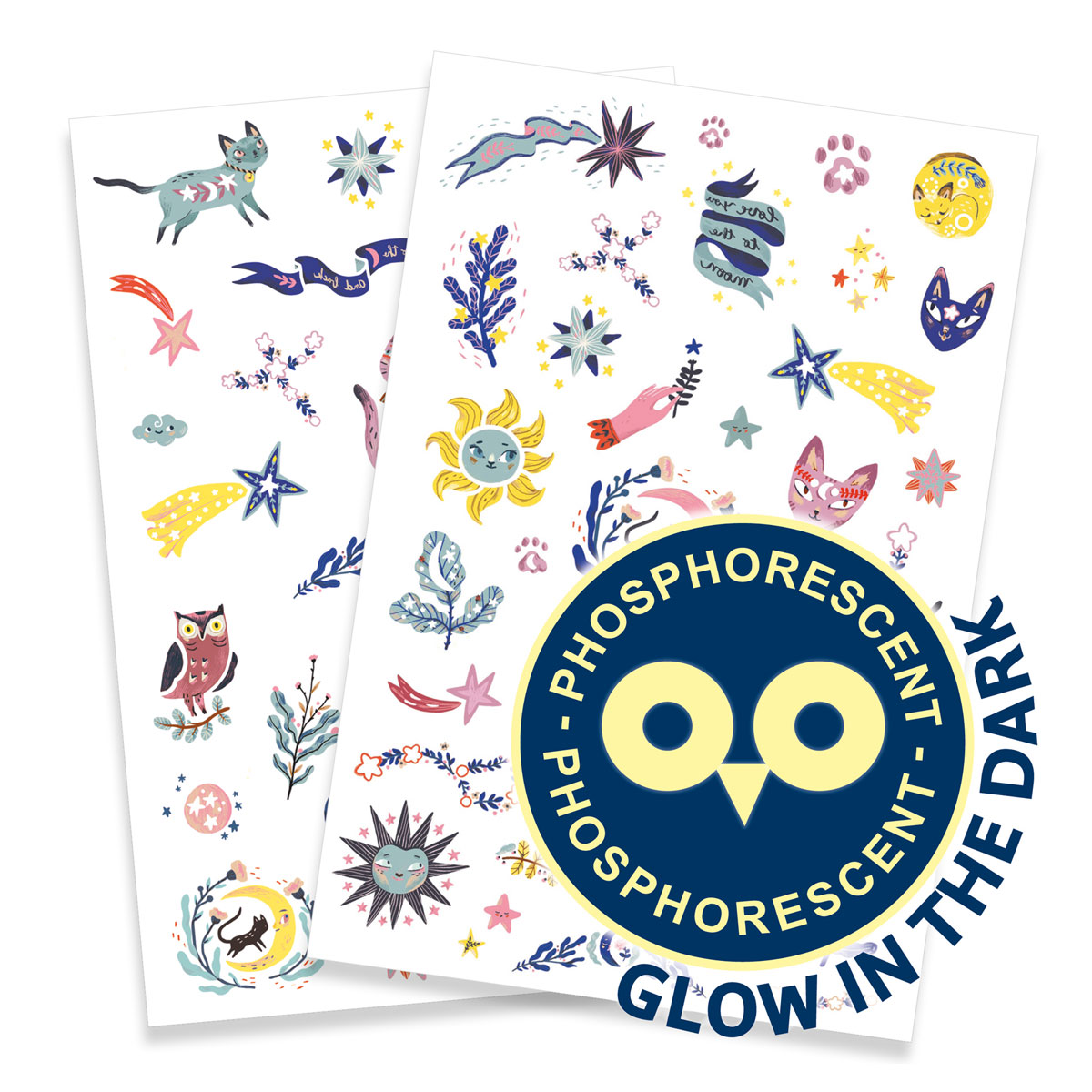 Два листа временных татуировок на ночную тематику с изображением всевозможных очаровательных животных. Детям особенно понравятся светящиеся сюрпризы и дополнительные детали, которые появляются в темноте! Эти временные татуировки предварительно вырезаны, чтобы их было удобно использовать, и переносятся с помощью небольшого количества воды. Протестировано дерматологами.