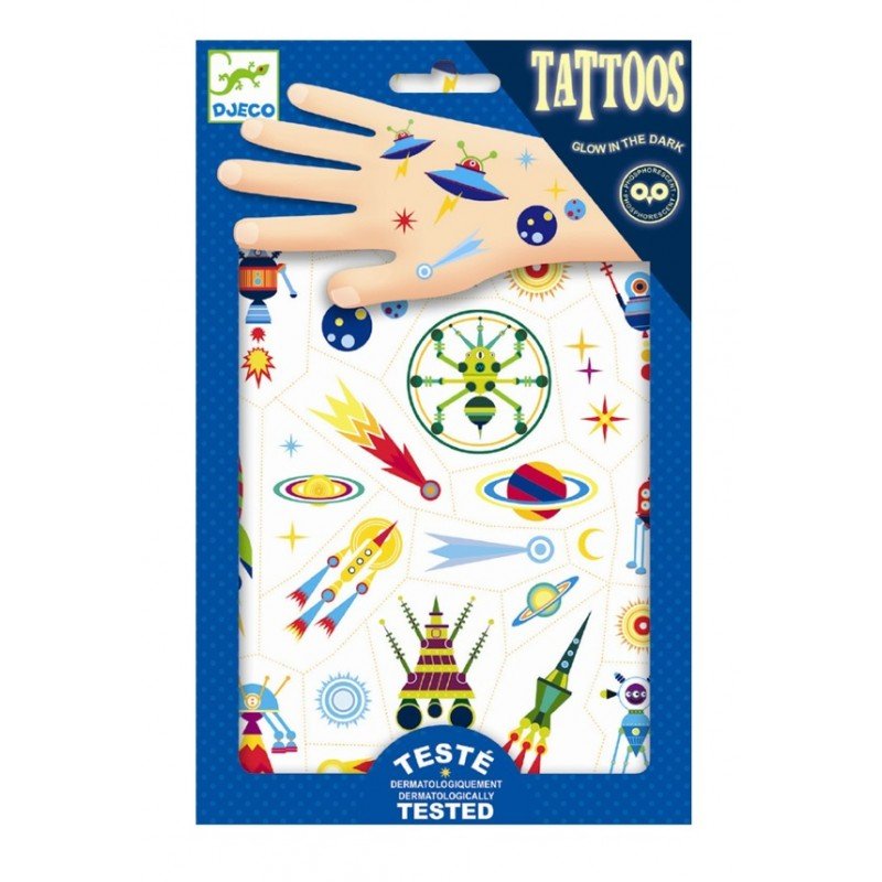 Два листа временных татуировок на космическую тематику. Детям особенно понравятся светящиеся сюрпризы и дополнительные детали, которые появляются в темноте! Эти временные татуировки предварительно вырезаны, чтобы их было удобно использовать, и переносятся с помощью небольшого количества воды. Протестировано дерматологами.