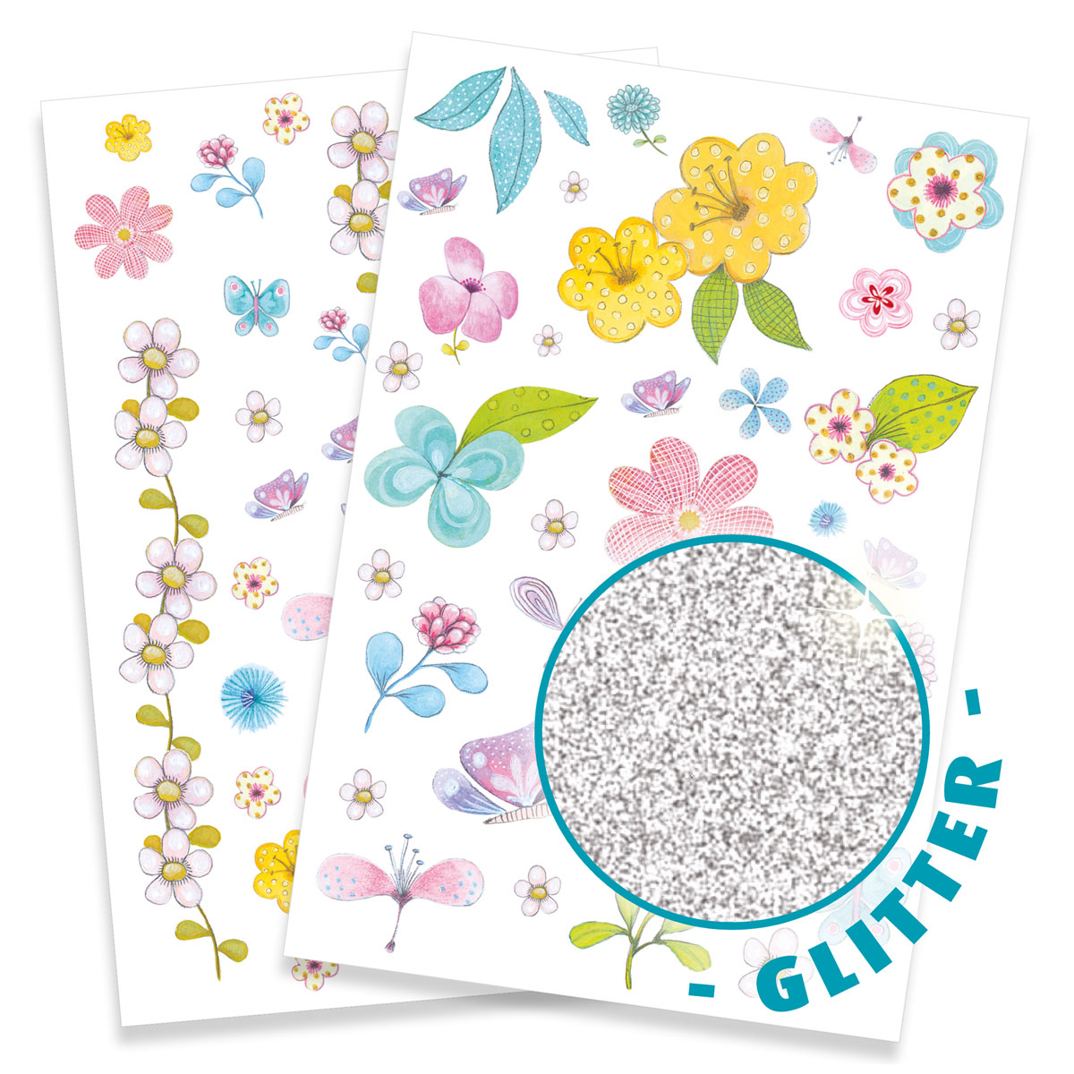 Два листа временных татуировок с элегантным цветочным рисунком. Детям понравятся эти мерцающие татуировки! Они предварительно вырезаны, чтобы их было удобно использовать, и переносятся небольшим количеством воды. Дерматологически протестированы.