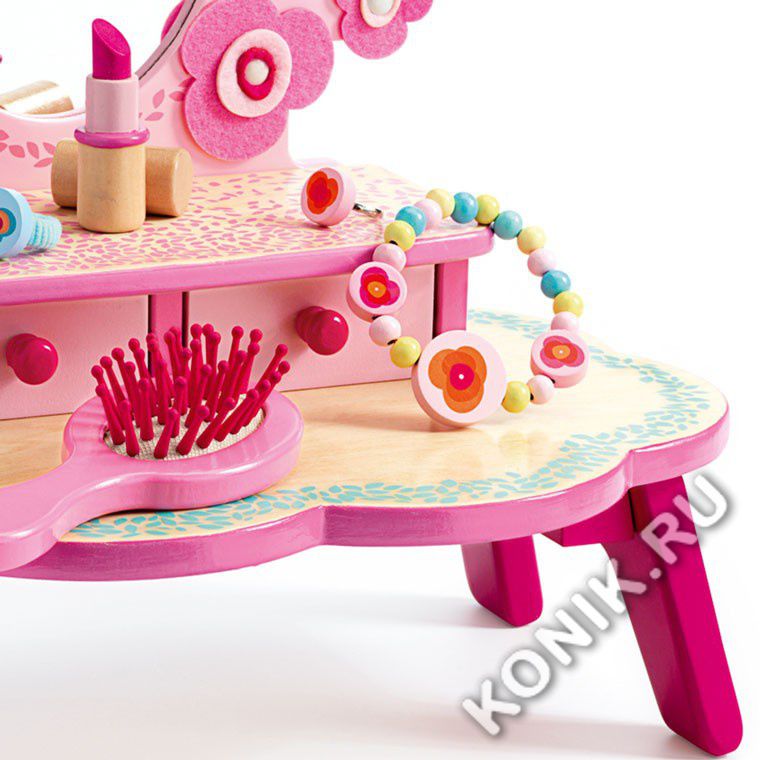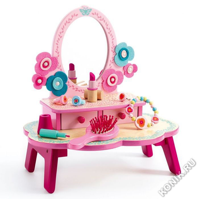 Туалетный столик Flora — очаровательный деревянный туалетный столик с большим зеркалом, чтобы маленькие девочки могли весело провести время, делая прически и макияж! Имеет два ящика для хранения украшений и множество косметических принадлежностей.