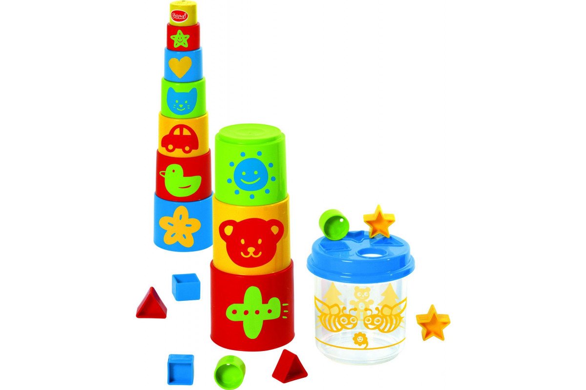 Малышу предстоит построить пирамидку от самой большой формочки к самой маленькой. Также можно наоборот, собирать формочки, как матрешку - меньшую по размеру в большую.